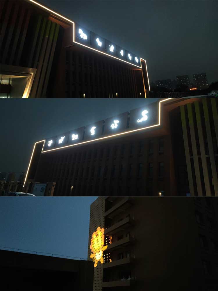 西安市兒童福利院亮化工程,主要是采用線條燈對樓體的頂部和側(cè)面輪廓進(jìn)行勾勒,主樓安裝十二生肖發(fā)光造型,側(cè)墻采用圖案燈進(jìn)行動畫投影,打出絢麗多彩的動畫卡通人物,與建筑的實(shí)用完整結(jié)合。